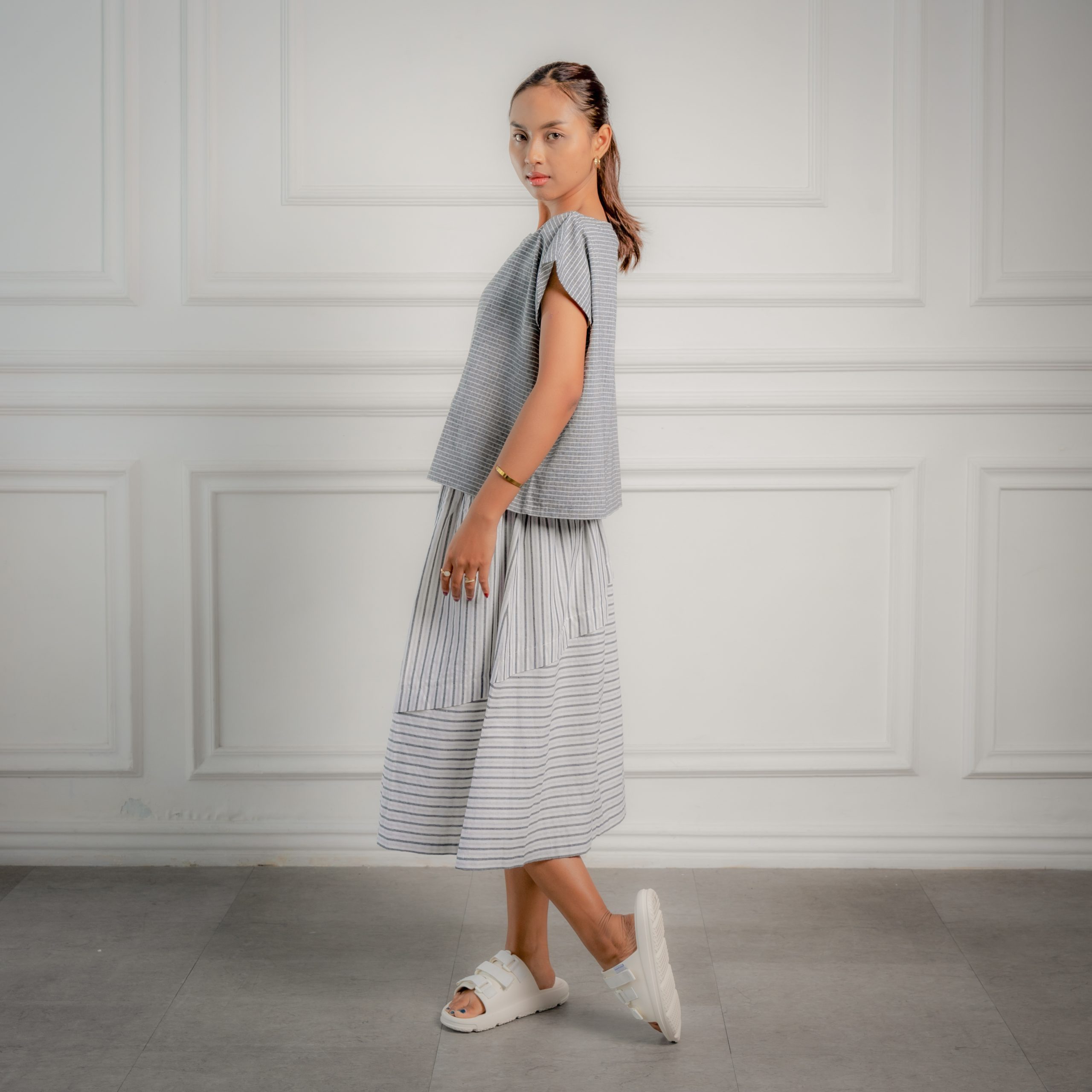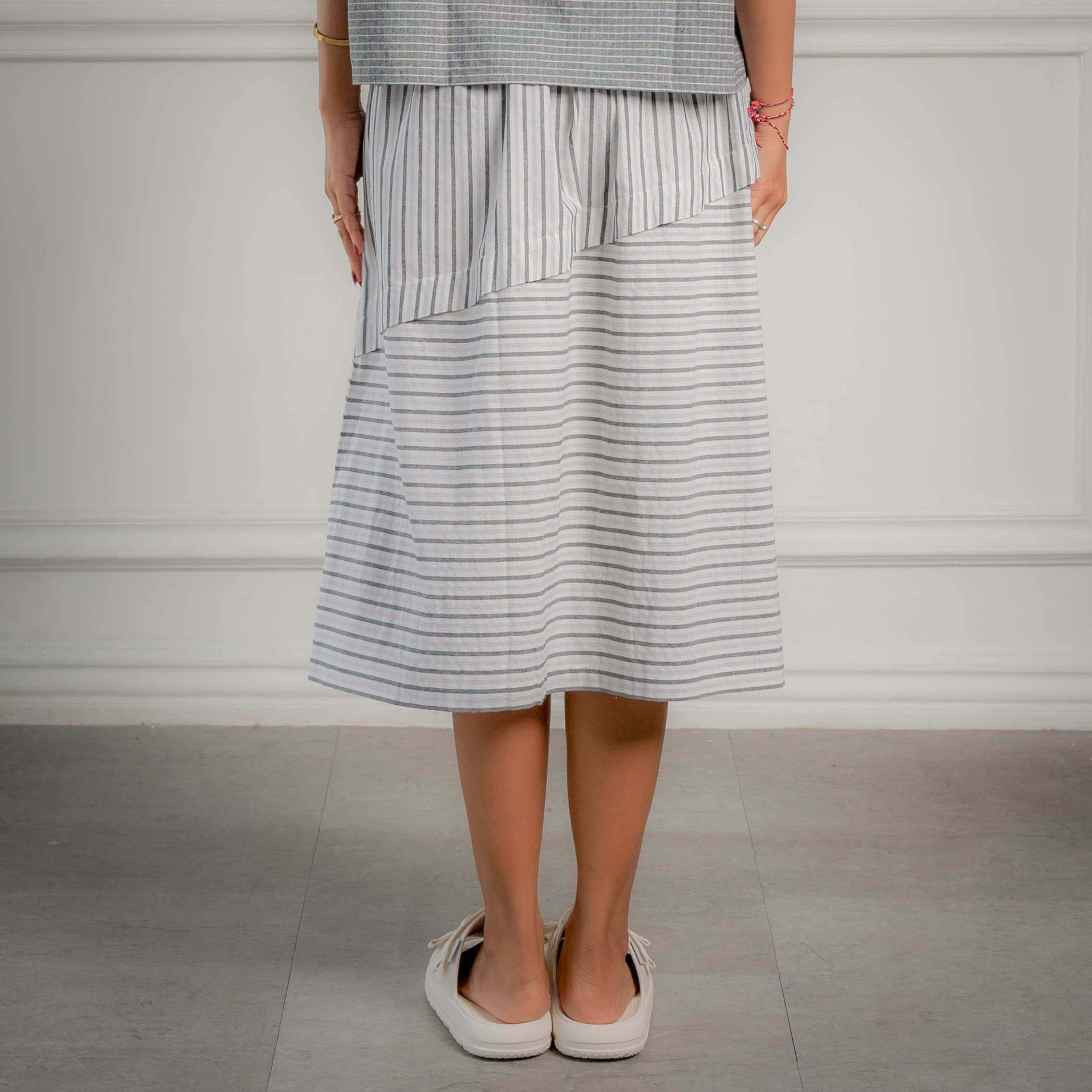 A midi skirt with elasticated waist and seamed part at the bottom, featuring a unique pattern layout of it’s stripes