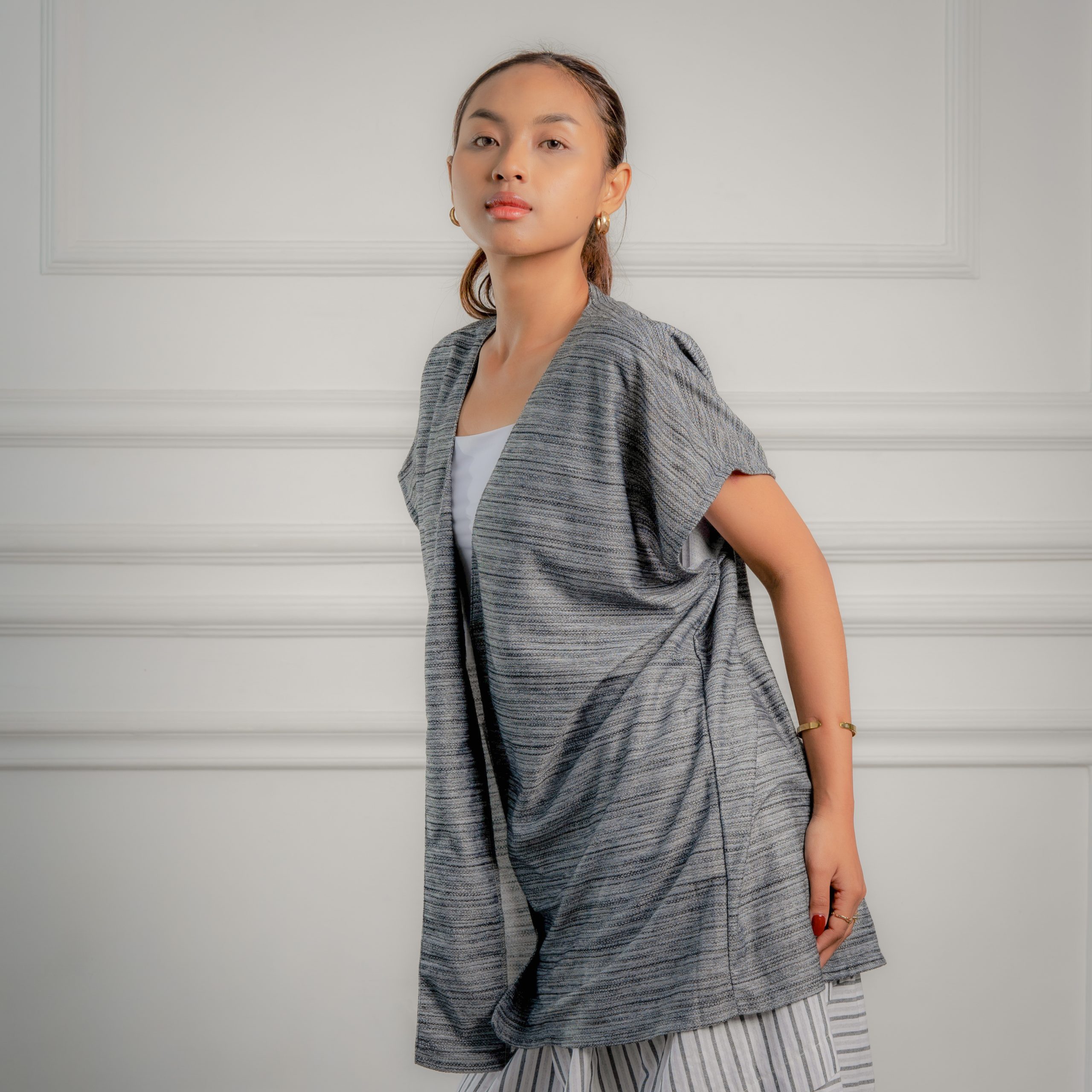 A genderless, V-neck oversized outer in square cut that fits on her / him